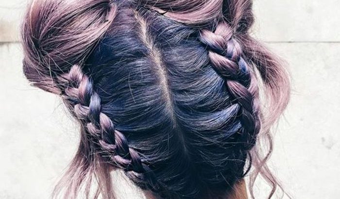 african braid macaroons, some lashes loose, hair color purple and pink, idea of hairstyle with extravagant and colorful braids