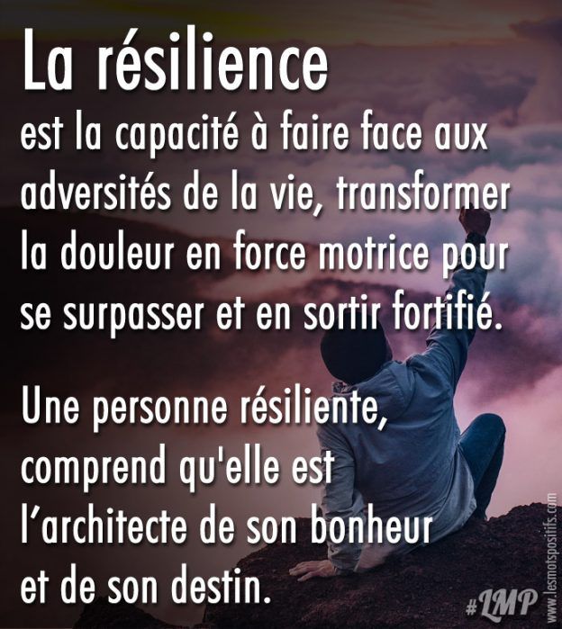Resilience is the ability to cope with the adversities of life, transforming pain into a driving force to surpass oneself and come out of it fortified. A resilient person understands that she is the architect of her happiness and destiny. #citation #citationdujour #proverbe #quote #frenchquote # thoughts #phrases