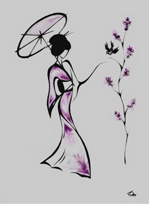 We see a woman holding an umbrella in her left hand. There is a tree in front of her with purple flowers. A black bird is resting on one of the branches of the tree. Her dress has touches of mauve. The artwork is made with black china ink and purple watercolor. The style of the work recalls the style of Chinese or Japanese drawings. I like this because she has the same style as another culture and that she is simple, I like the delicate touches of mauve.