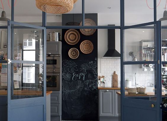 At Anne-Sophie's, Freckles Design || The blue steel workshop canopy which delimits the kitchen